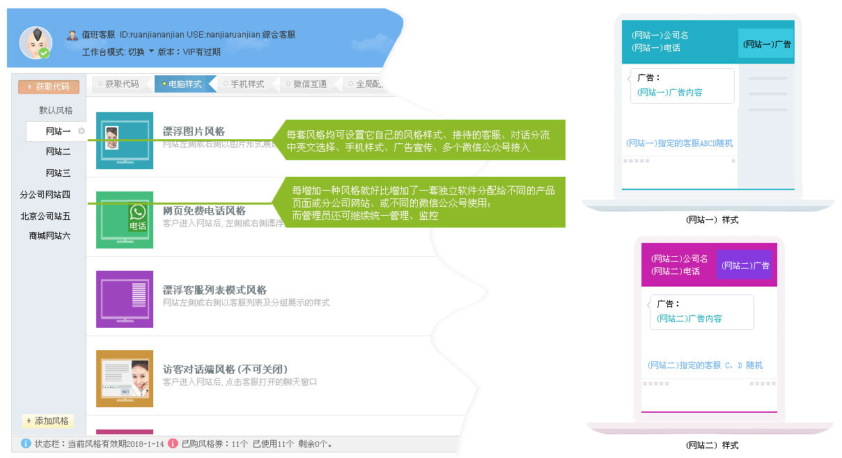 只需要增加網(wǎng)站風(fēng)格自定義就可以使用同樣的客服來接待,而只使用一個(gè)軟件賬號(hào)管理